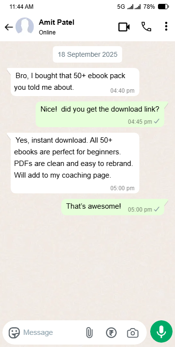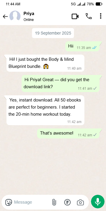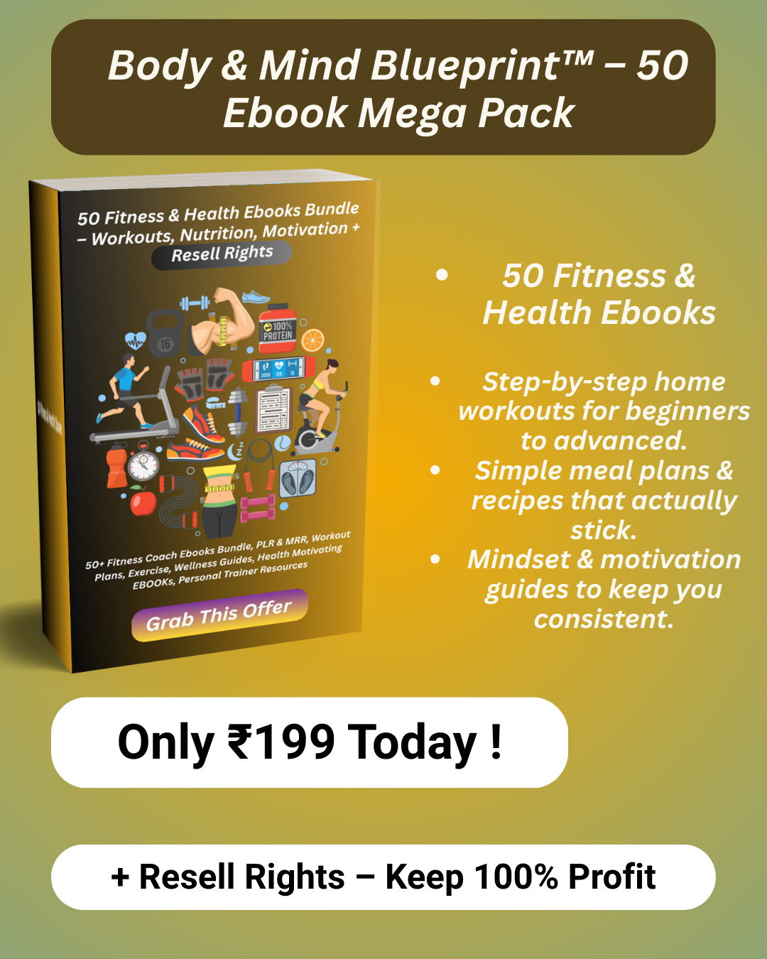 The Body & Mind Blueprint – 50+ Ebook Mega Pack is the easiest and most affordable way to take control of your health and fitness while also creating an income opportunity for yourself. Inside, you’ll find 50 professionally designed ebooks covering workouts, nutrition, wellness, and motivation — everything you need to transform your body and mindset. What makes this bundle even more powerful is that it comes with Master Resell Rights, which means you can sell it yourself and keep 100% of the profit. Whether you’re a beginner looking to start your fitness journey, a coach wanting extra resources for clients, or someone searching for a simple online side hustle, this bundle is made for you. And at just ₹199, it’s an investment that pays for itself from day one.
